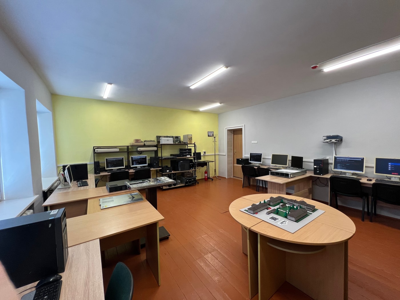 Лабораторія розташована у «довгому» крилі комп’ютерного поверху. Простір має достатню кількість робочих місць для індивідуальної роботи студентів під час і після занять. Кабінет об’єднаний у локальну мережу з доступом до інтернету та Wi-Fi покриттям. Дотримується принцип одноманітності апаратного та програмного забезпечення.