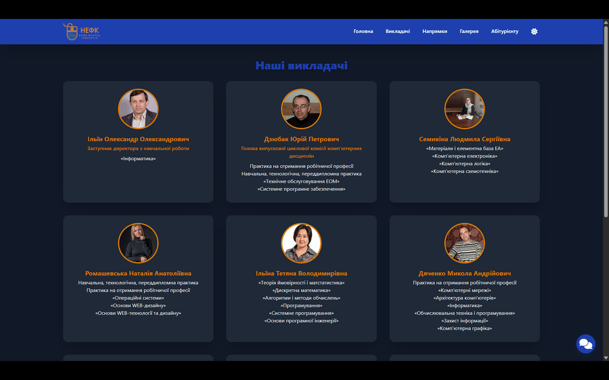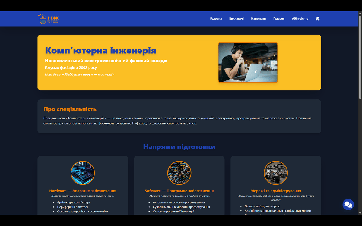 Головною технічною особливістю ресурсу стала інтеграція "розумного" ШІ-чату. Цей інтерактивний помічник здатен у режимі реального часу консультувати відвідувачів сайту, відповідаючи на запитання абітурієнтів та студентів щодо напрямів підготовки, умов вступу чи викладацького складу. Проєкт гармонійно поєднує структурований дизайн у фірмових кольорах коледжу із передовими цифровими рішеннями, показуючи, як штучний інтелект може автоматизувати створення контенту та покращити комунікацію з користувачами.